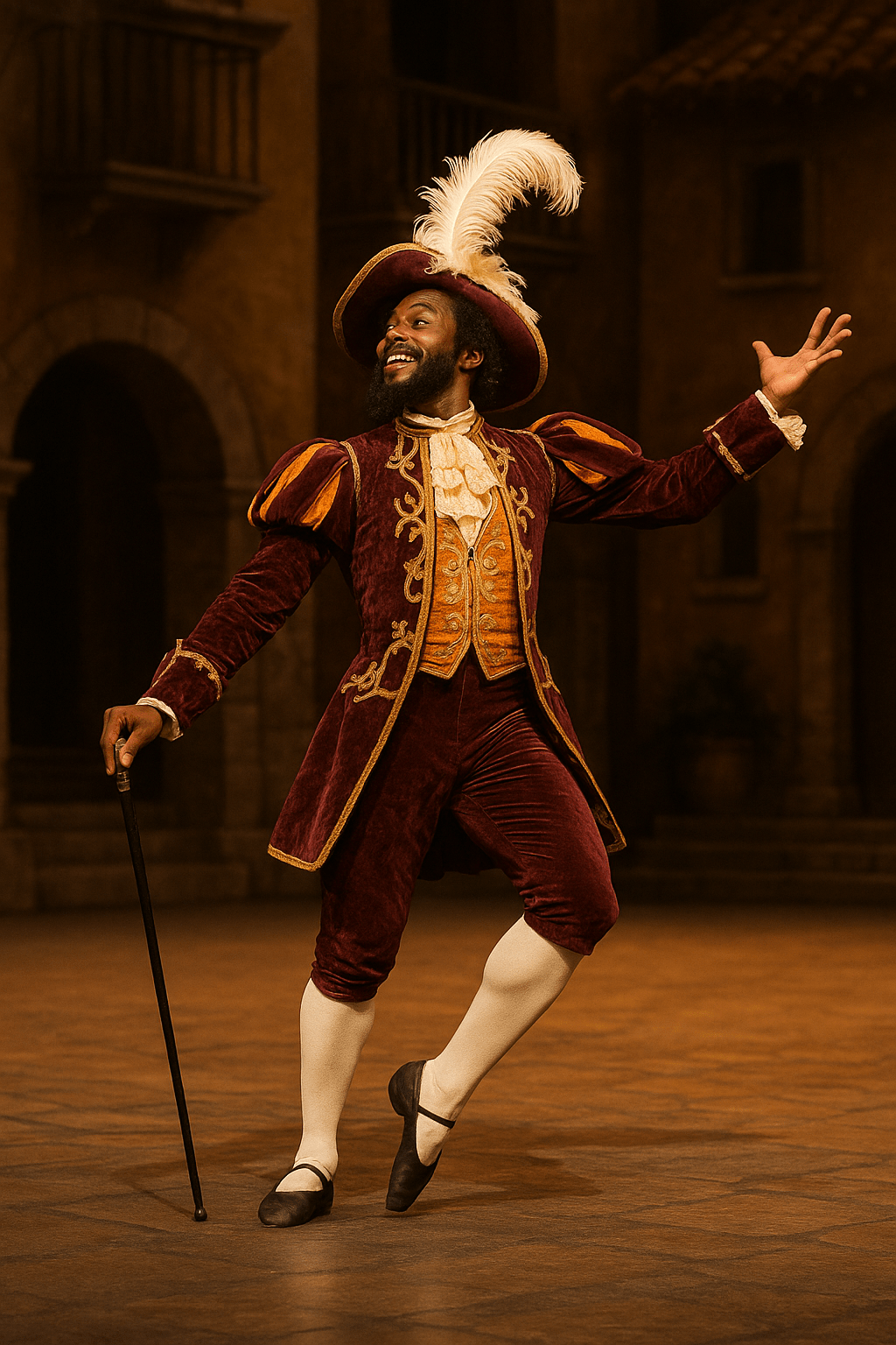 - Costume notes: Plumed hat, exaggerated epaulettes, cane or rapier; rich, slightly mismatched colors.